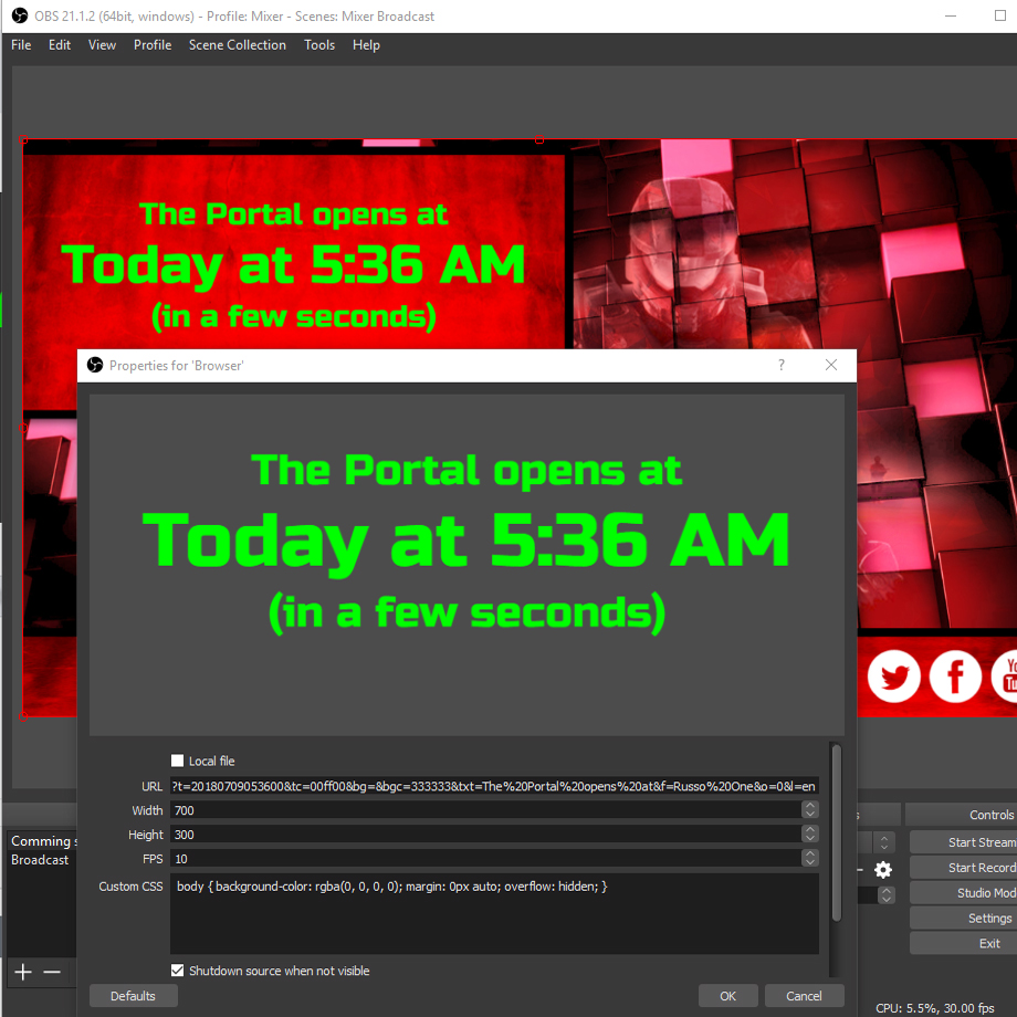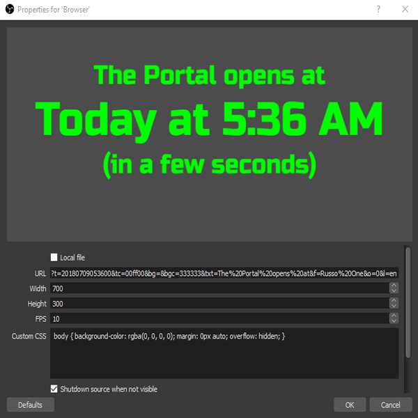 - For Width and Height enter your native stream resolution or the size of the background you specified (else the background won't display correctly, I'm working on a fix)